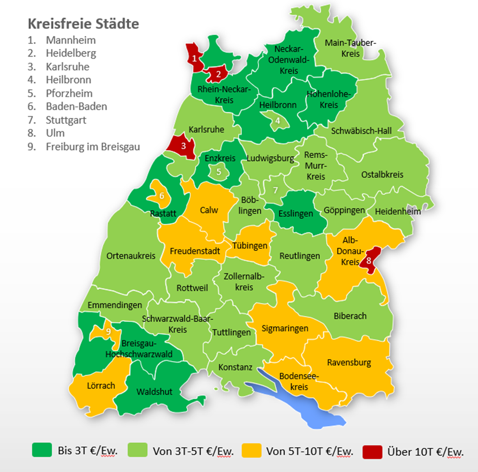 Die Stadtkreise Karlsruhe (11.237 Euro je Einwohner), Ulm (11.334 Euro je Einwohner), Heidelberg (10.785 Euro je Einwohner) und Mannheim (10.781 Euro je Einwohner) sind innerhalb von Baden-Württemberg die vier einzigen mit einer integrierten Pro-Kopf-Verschuldung zum 31.12.2024 von mehr als 10.000 Euro pro Einwohner. Unter den Gesamtkreisen ist keiner mit einem vergleichbar hohen Wert. Im Gesamtkreis Lörrach liegt der Wert an der Spitze bei 7.001 Euro je Einwohner.