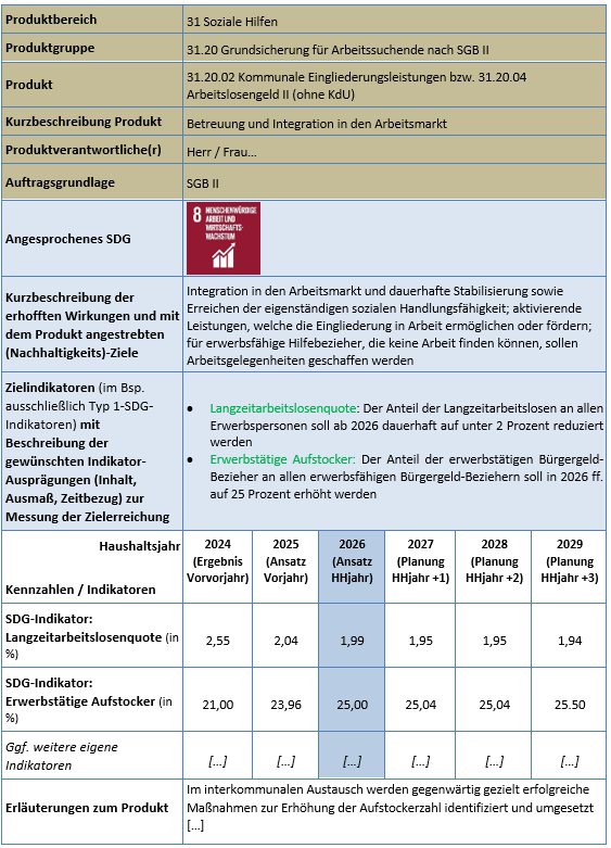 Die integrierten Typ 1 – Indikatoren zum SDG Nr. 8 (Menschenwürdige Arbeit und Wirtschaftswachstum) und Nr. 9 (Industrie, Innovation und Infrastruktur) können vor Ort selbstverständlich um weitere steuerungsrelevante Kennzahlen und Indikatoren ergänzt werden. Sie werden in den nachfolgenden Muster-Produktblättern nach dem Schwerpunktprinzip Produkten zugeordnet. Im Einzelfall kann eine Zuordnung zu anderen Produkten u.U. ebenfalls praxistauglich sein.