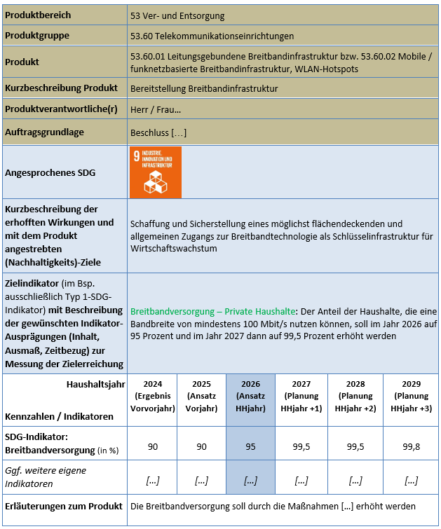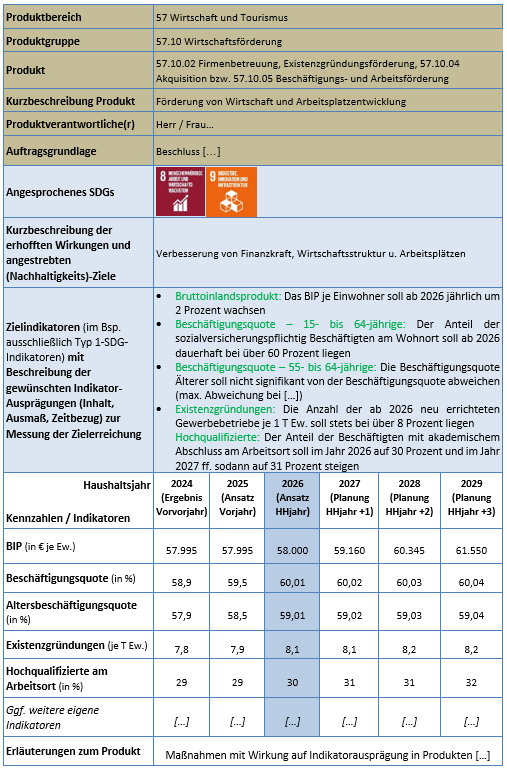 Nachfolgend werden exemplarische und durch die Kommune nach eigenen Bedarfen, Möglichkeiten und Schwerpunkten anpassbare Muster-Produktblätter für den Kommunalhaushalt nach kommunalem Produktplan BW (Stand 01.05.2020) dargestellt, die zur Steuerung des nachhaltigen Wirtschaftswachstumsziels genutzt werden können – je nach vor Ort genutzter Haushaltssoftware können diese dann angepasst verwendet werden.