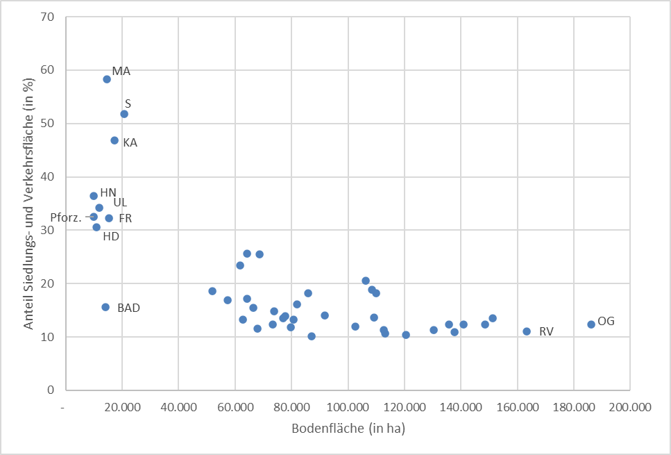 Im Vergleich der Stadt- und Landkreise differiert die Gesamtfläche sowie der Anteil der Siedlungs- und Verkehrsfläche innerhalb des Landes stark. In den Stadtkreisen ist der Anteil der Siedlungs- und Verkehrsfläche bei insgesamt kleineren Flächen deutlich höher als in den Landkreisen. An der Spitze liegt der Anteil der Siedlungs- und Verkehrsflächen in Mannheim bei 58,3 Prozent. Eine Sonderstellung innerhalb der Stadtkreise nimmt Baden-Baden ein. Hier liegt, aufgrund der großen Waldflächen der Stadt, der Anteil der Siedlungs- und Verkehrsfläche nur leicht über dem Landesniveau (15,6 Prozent).