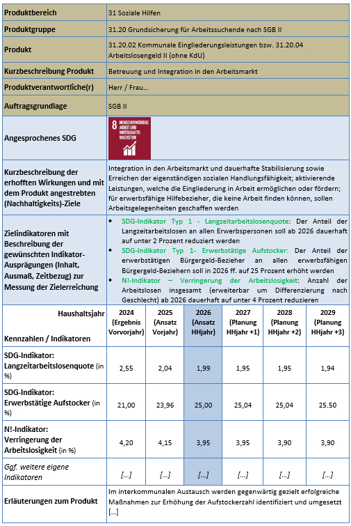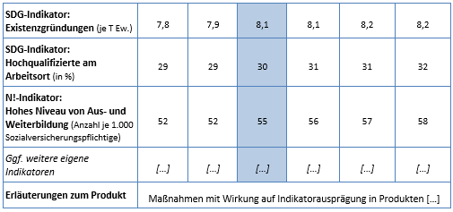 Konkret werden im Haushalt (und folglich natürlich korrespondierend auch bei der Jahresrechnung für den Plan-Ist-Vergleich und ggf. im unterjährigen Berichtswesen) im Schwerpunktprinzip bei denjenigen Produkten bzw. Schlüsselpositionen Indikatoren angebracht, die auf das Ziel/SDG Nr. 8 „Menschenwürdige Arbeit und Wirtschaftswachstum“ einzahlen. Dabei kann auf die kommunalen SDG-Indikatoren zurückgegriffen werden. Sie sind kompatibel und kongruent mit der Deutschen Nachhaltigkeitsstrategie. Bestenfalls können kommunale SDG-Indikatoren vom Typ 1 mit ihren spezifischen Vorteilen genutzt werden, Typ 2-Indikatoren sind prinzipiell aber auch möglich. Speziell für baden-württembergische Kommunen können additiv die sog. N!-Indikatoren genutzt werden.