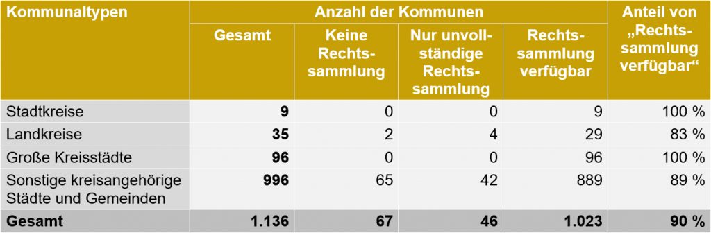 - Kommunen, auf deren Webseite keine Rechtssammlung auffindbar war oder Kommunen, deren Rechtssammlung keinen Inhalt hatte. Zu dieser Gruppe zählt auch der Fall, dass es nur eine Seite mit aktuellen amtlichen Bekanntmachungen oder Amtsblättern gab: Dabei handelt es sich um keine Rechtssammlung, denn spezifische Satzungen sind hier nur sehr schwer zu finden und ältere Satzungen fehlen in der Regel.