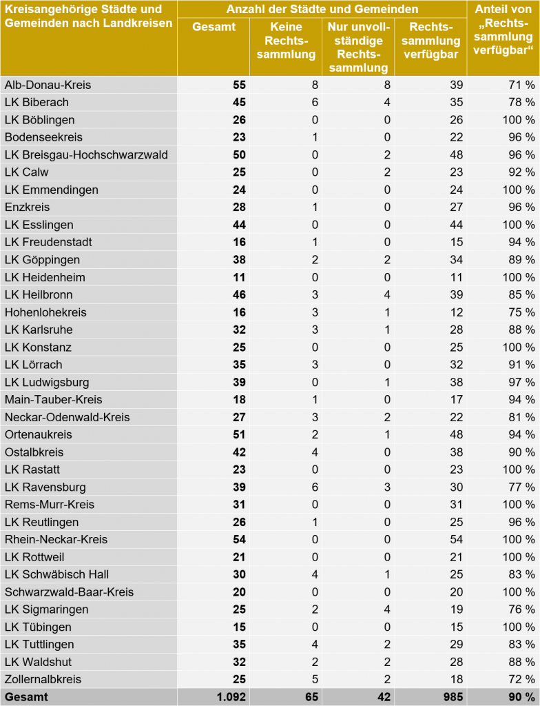 Bei den 1.092 kreisangehörigen Städten und Gemeinden (inkl. Große Kreisstädte) zeigt sich ein im Landkreis-Vergleich heterogenes Bild. In elf von 35 Landkreisen haben alle Städte und Gemeinden eine online verfügbare Rechtssammlung. Demgegenüber liegt der Anteil in sechs Landkreisen sogar unter 80 %: Alb-Donau-Kreis, Landkreis Biberach, Hohenlohekreis, Landkreis Ravensburg, Landkreis Sigmaringen und Zollernalbkreis. Am niedrigsten liegt der Anteil im Alb-Donau-Kreis mit 71 %.