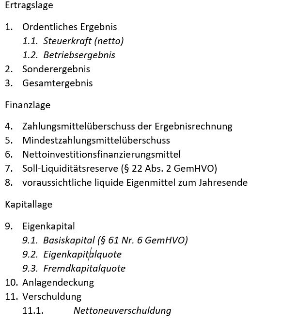 Zur Bestimmung des unbestimmten Rechtsbegriffs der Finanziellen Leistungsfähigkeit bedarf es einer Operationalisierung, mithin einer mathematischen Fassbarkeit. Nach § 6 S. 3 Nr. 2 GemHVO sollen im Vorbericht zum Haushaltsplan u.a. verbindlich vorgegebene Kennzahlen zur Finanziellen Leistungsfähigkeit dargestellt werden. Diese verbindlichen Kennzahlen finden sich in Anlage 16 der VwV zum Produkt- und Kontenrahmen.